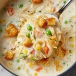 This creamy chicken noodle soup is a homemade twist on instant cup-a-noodle soup, packed with real ingredients for a hearty, wholesome, and cozy meal. It’s creamy without the use of cream, featuring tender chicken, delicate angel hair pasta, fresh vegetables, and crispy bacon and mini croutons for added texture and flavor.