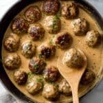 • Can I make these meatballs gluten-free? Yes! Use gluten-free bread for soaking and substitute the all-purpose flour in the gravy with a gluten-free flour blend or cornstarch slurry.