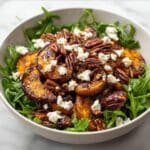 This vibrant Roasted Sweet Potato Salad combines the natural sweetness of caramelized sweet potatoes with the peppery freshness of rocket (arugula), crunchy toasted pecans, savory crispy bacon, and creamy crumbled goat cheese or Danish feta. A zesty honey lemon dressing ties all the flavors together, making it a perfect light meal or a festive side dish that’s bursting with textures and balanced flavors.