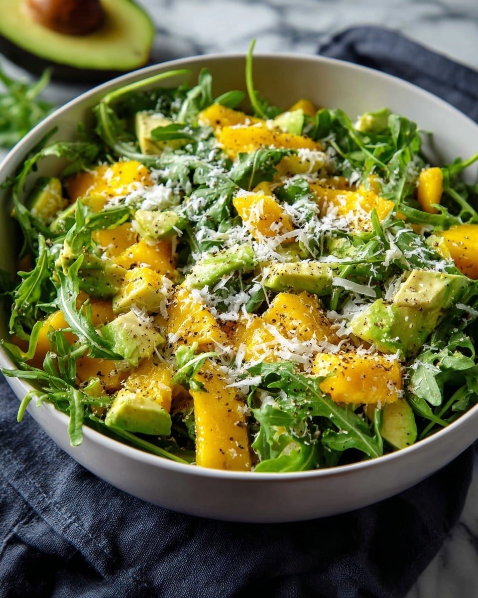 A refreshing Mediterranean salad combining the peppery bite of fresh arugula with creamy avocado and sweet mango, accented by crumbled feta cheese and toasted nuts for added texture and flavor. Perfect for a light, nutritious meal or a vibrant side dish.